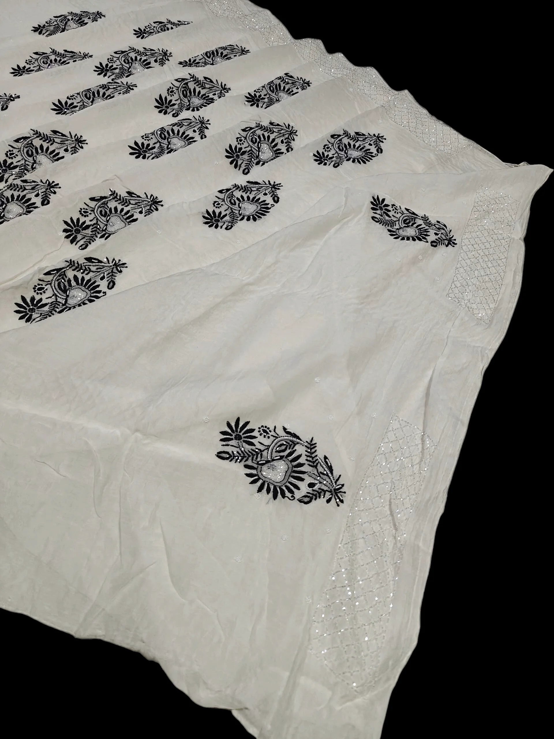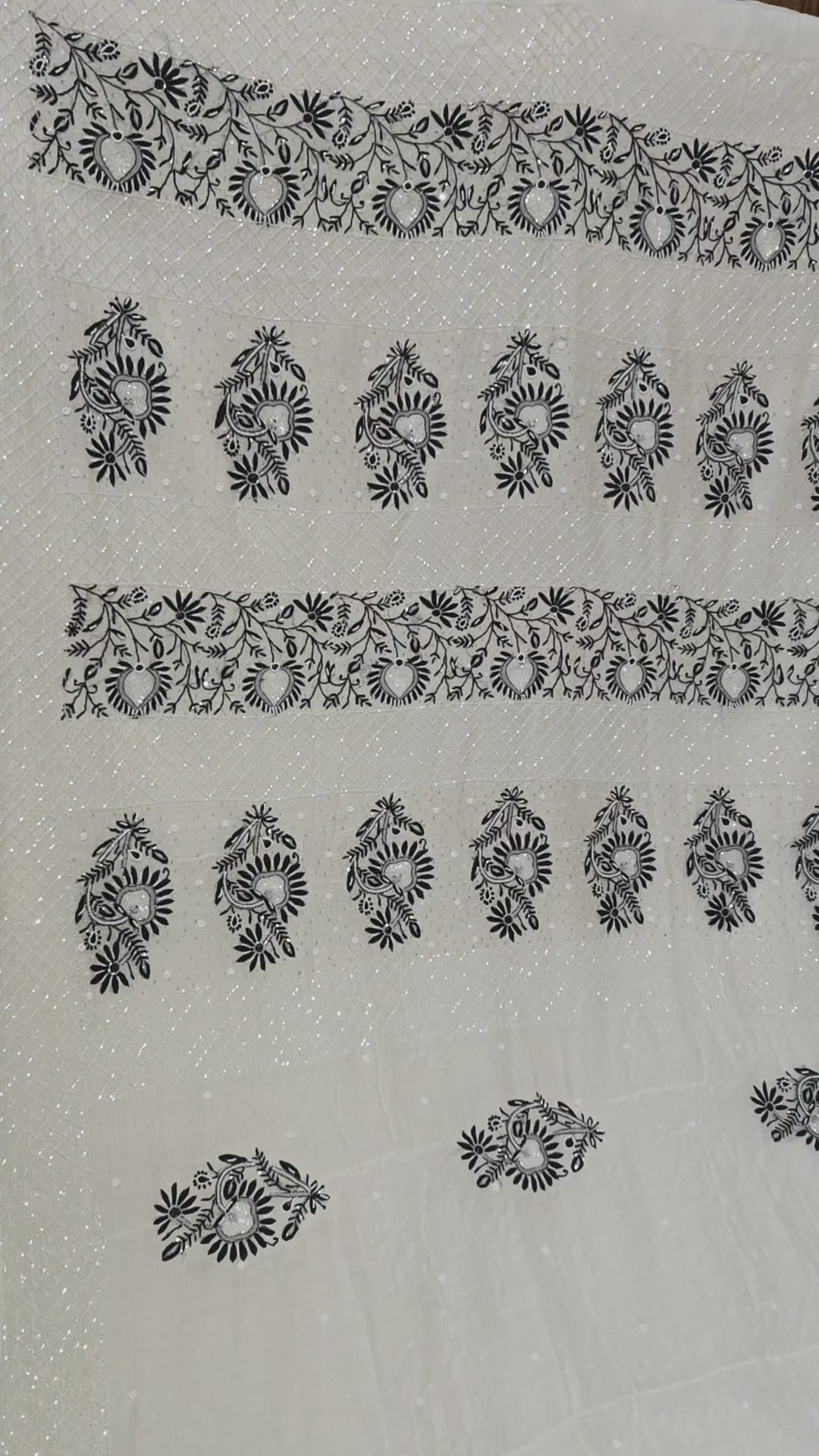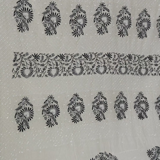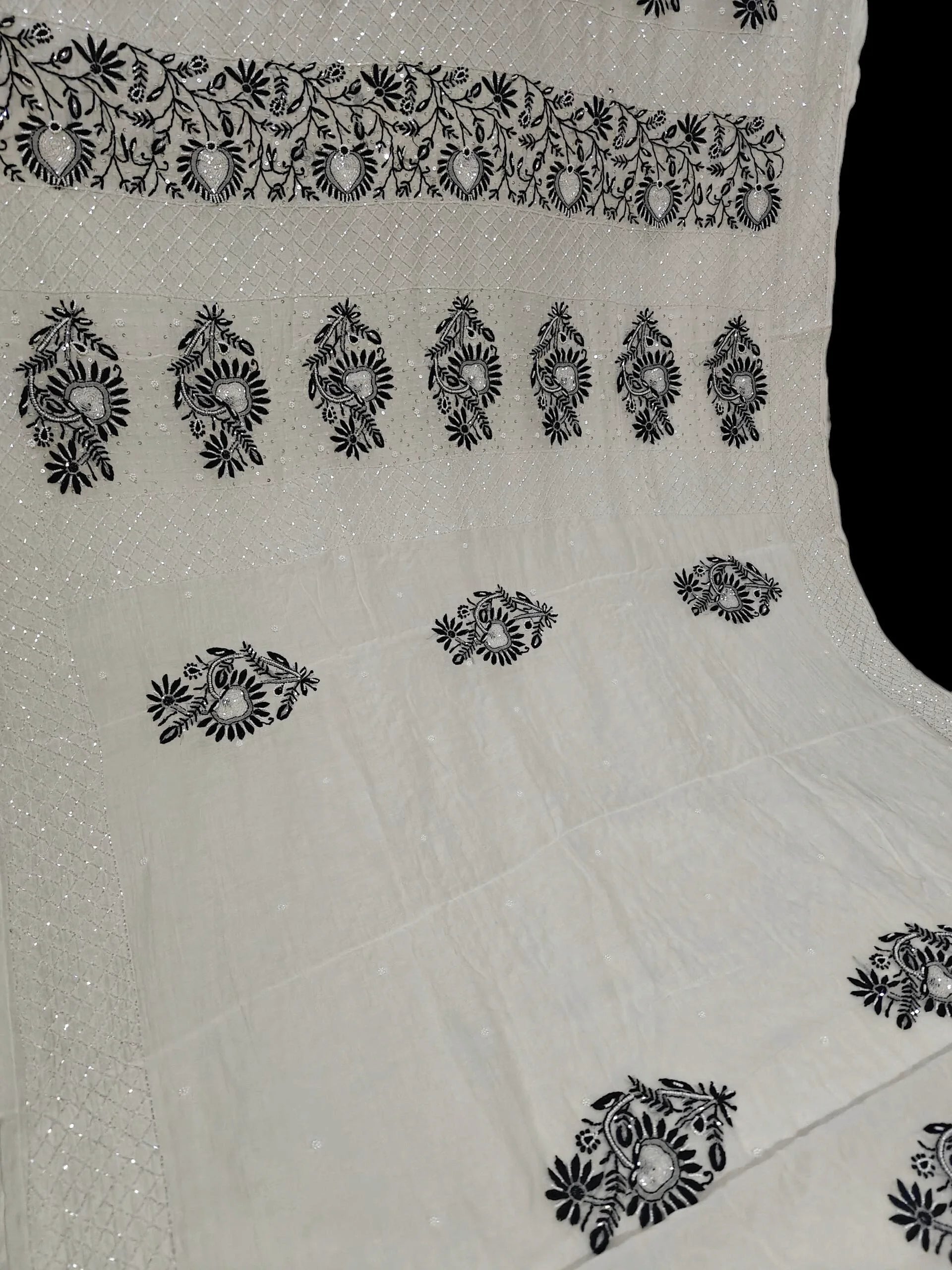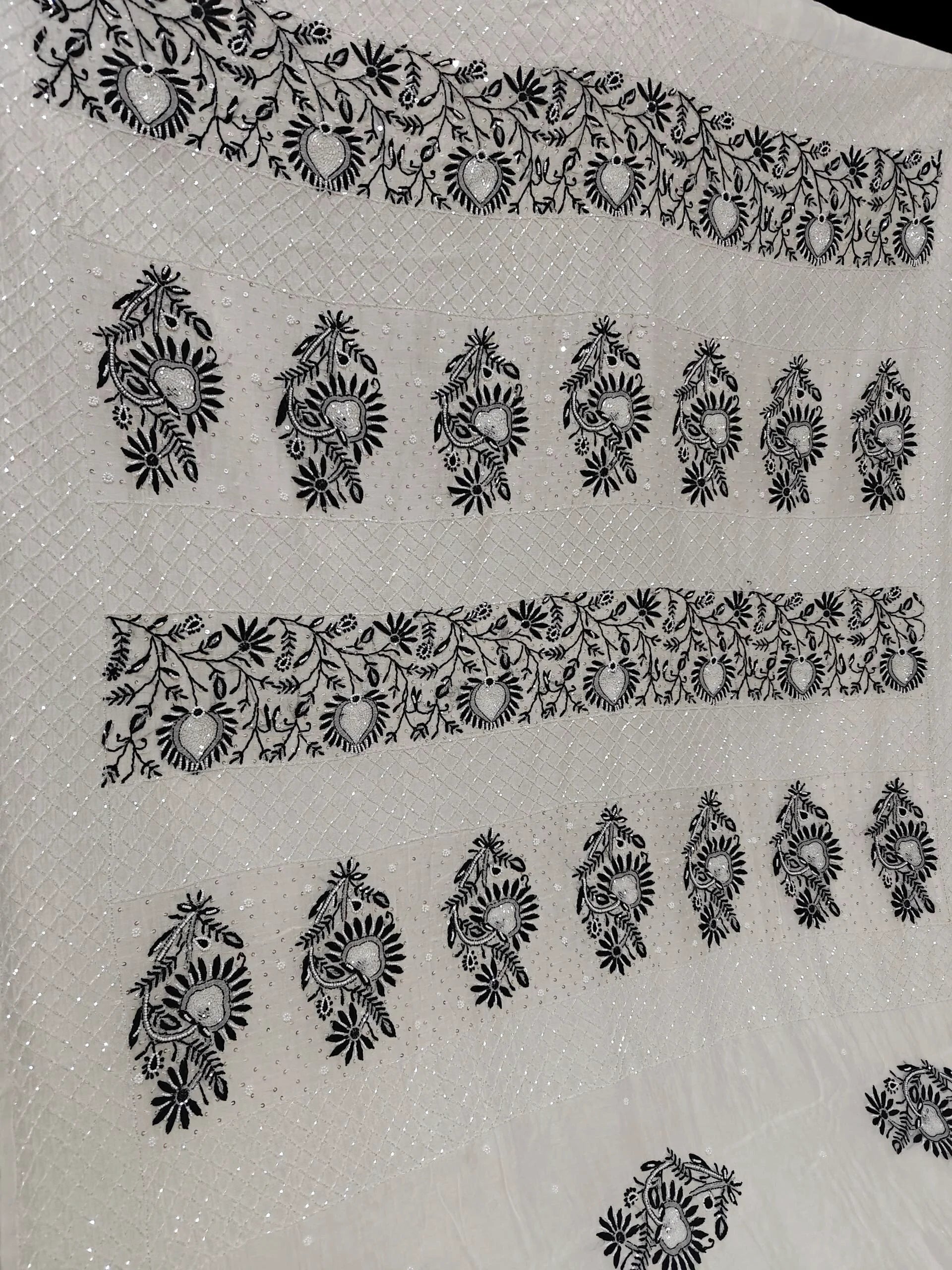 Embroidery: Intricate Chikankari in black thread with shimmering Moti Cut Dana embellishments