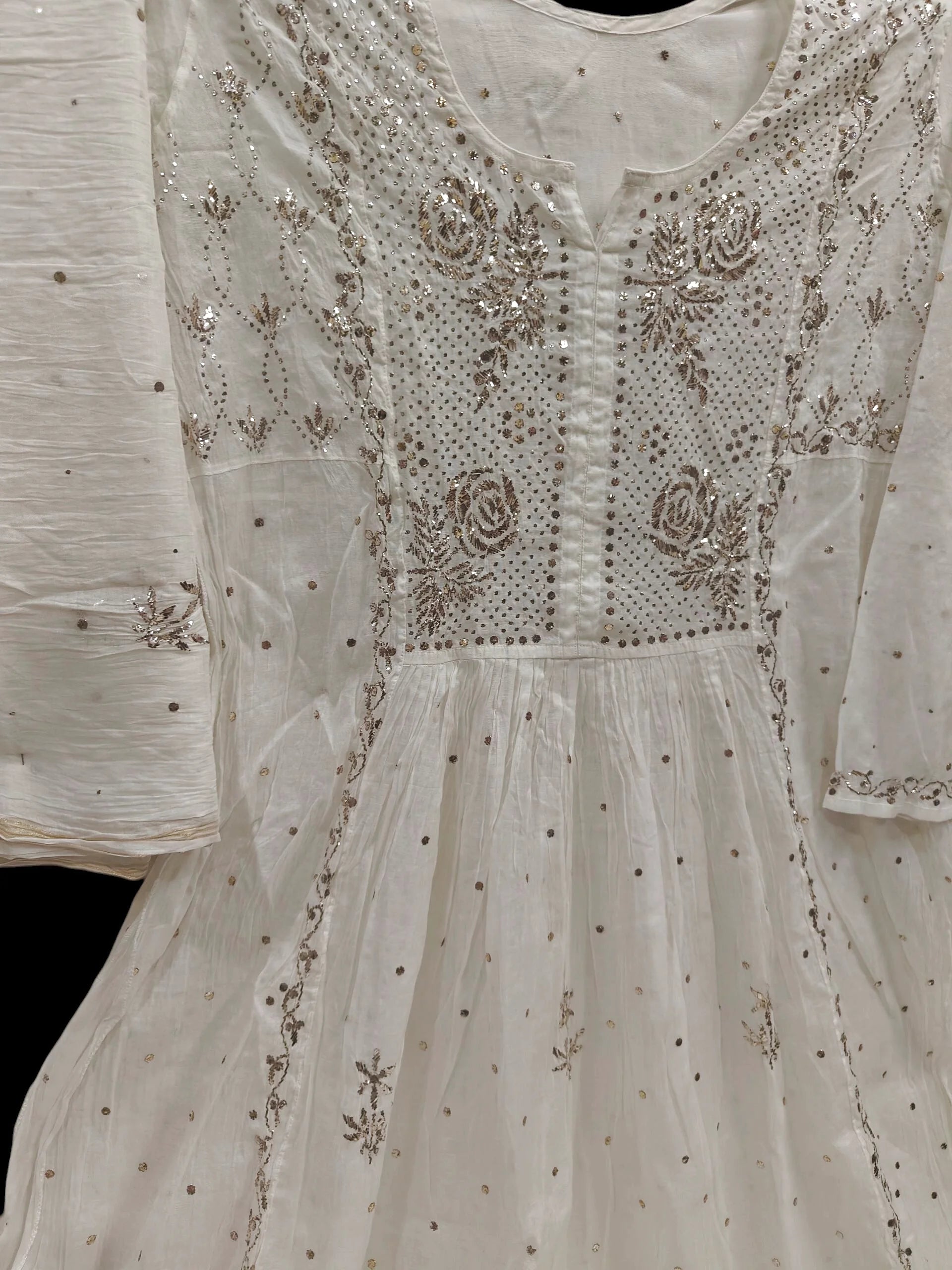Intricate Mukesh Kamdani Gown with Dupatta – Semi-Stitched | Pure Mul Fabric